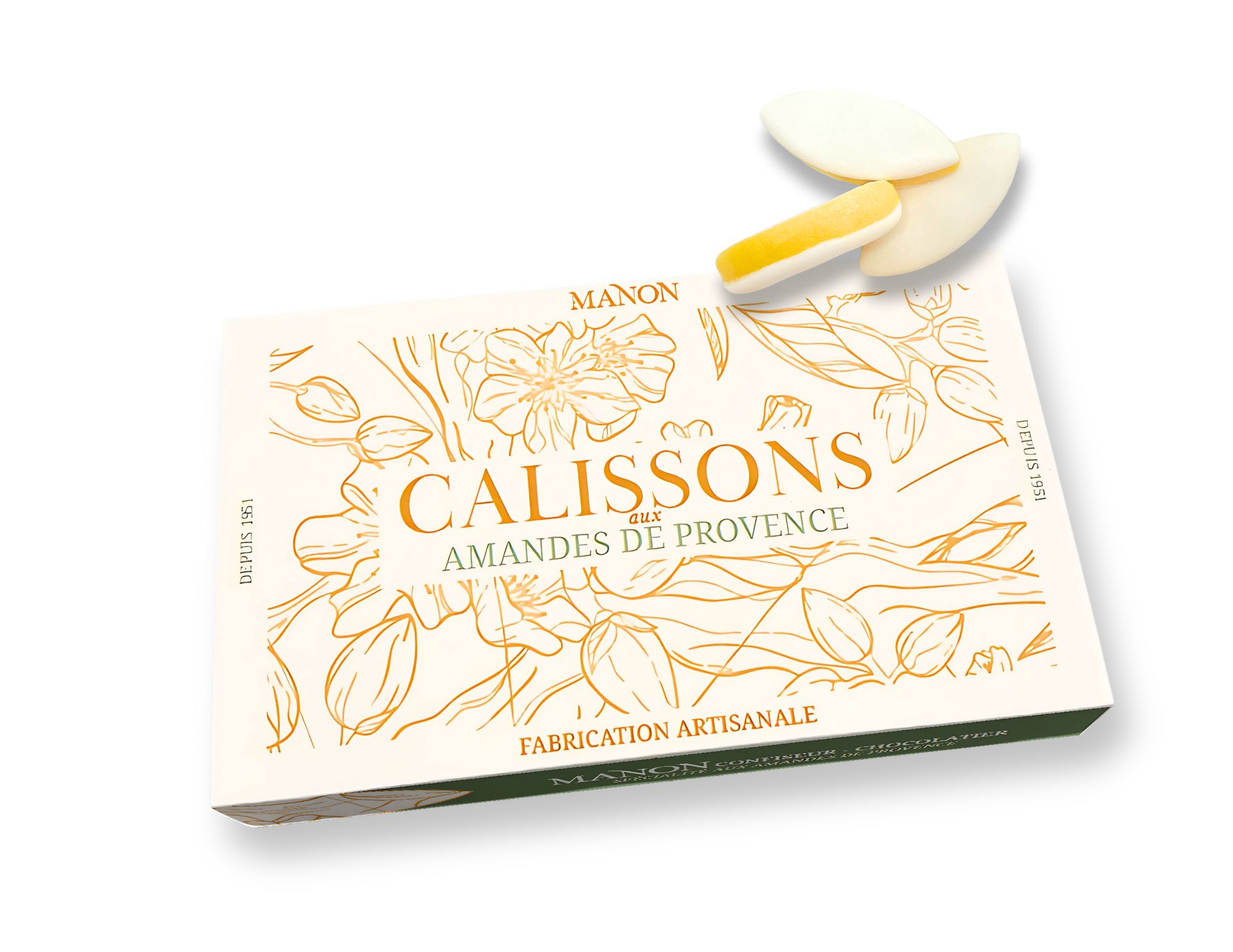 Cette confiserie, en forme d’amande, est le résultat du mariage subtil entre l’amande et de melon confît, réhaussée d’un zeste d’écorces d’orange confites et recouverte de glace royale.